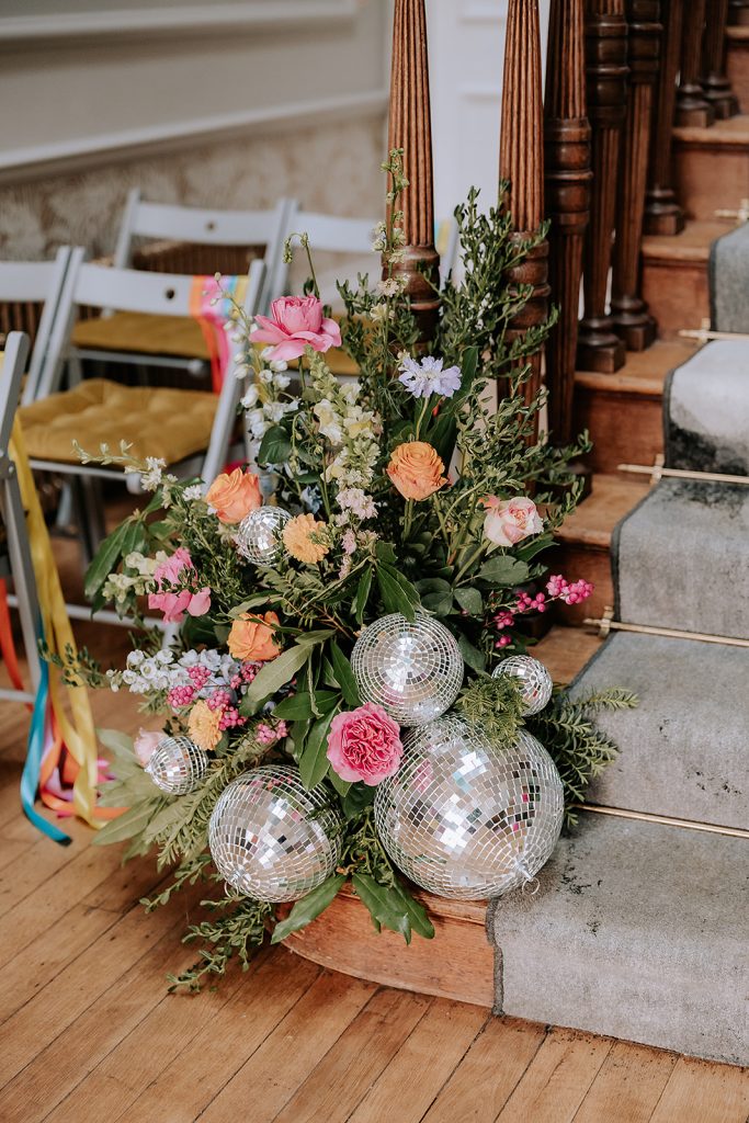 The creative geniuses at Occasions took the glitterball theme and ran with it with sparkling displays on the stairs and altar, and even bedazzling our gold gazebo outside.